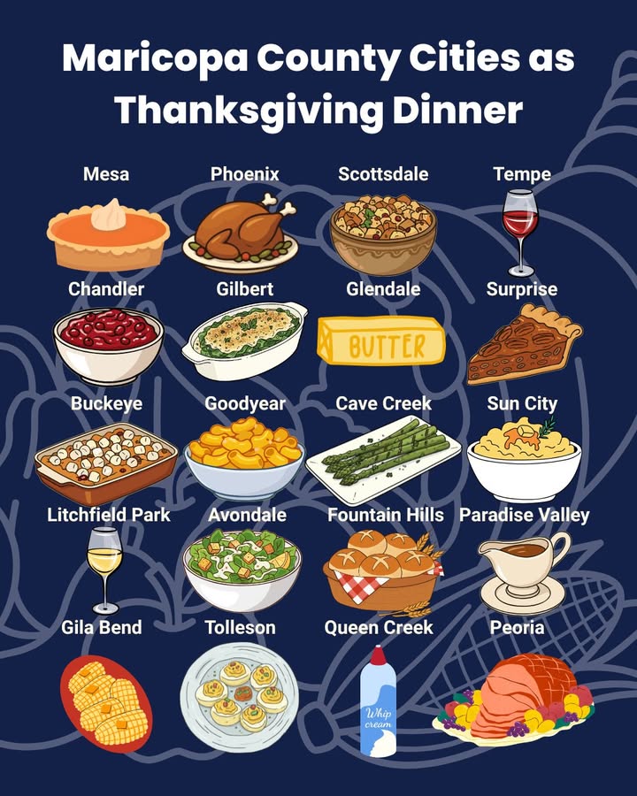 Maricopa County in Arizona recently shared a playful post comparing its cities to elements of a Thanksgiving dinner. The post asked, "If Maricopa County cities were Thanksgiving dinner… where are you going for seconds?" The list included cities such as Mesa, Phoenix, Scottsdale, Tempe, Chandler, Gilbert, Glendale, Surprise, Buckeye, Goodyear, Cave Creek, Sun City, Litchfield Park, Avondale, Fountain Hills, Paradise Valley, Gila Bend, Tolleson, Queen Creek, and Peoria. Additional items mentioned in the post were “Butter” and “Whip cream.”